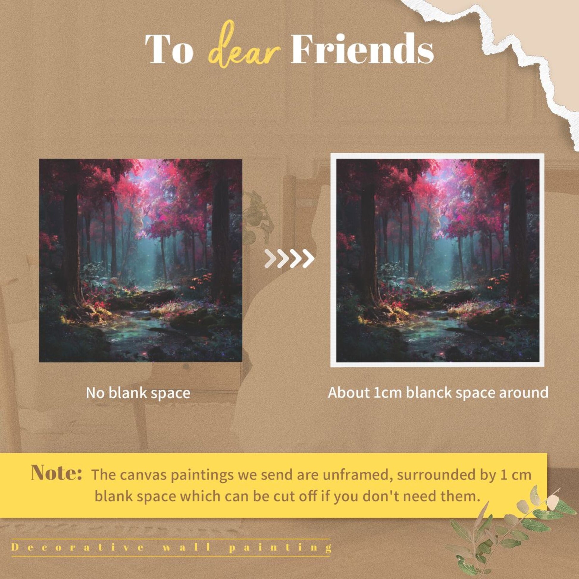 This set of frameless square decorative canvas prints captures the wonderful scene of a dreamy forest and a gurgling stream. In the dense woods, the crimson leaves shine in the light, and the stream weaves through them. The agile light and shadow interweave with colorful flowers and plants, outlining a fairy - tale - like quiet world. Made of high - quality materials, the canvas presents delicate and realistic colors, and every detail is vivid, as if one can step into this natural secret land. Two sizes are available: 12''×12'' (width 11.8 inches/30 cm, height 11.8 inches/30 cm) and 16''×16'' (width 15.7 inches/40 cm, height 15.7 inches/40 cm), suitable for the decoration needs of different spaces such as living rooms, bedrooms, and offices. The product has a frameless design, with an approximately 1 - centimeter blank edge around (can be cut by yourself if not needed). It is packaged in a cylinder for easy transportation and storage. Hanging it on the wall, whether to create a warm home atmosphere or add an artistic touch to the office environment, it can integrate this natural beauty into daily life and become a touching scenery in the space. It is a high - quality choice for conveying poetry and style.