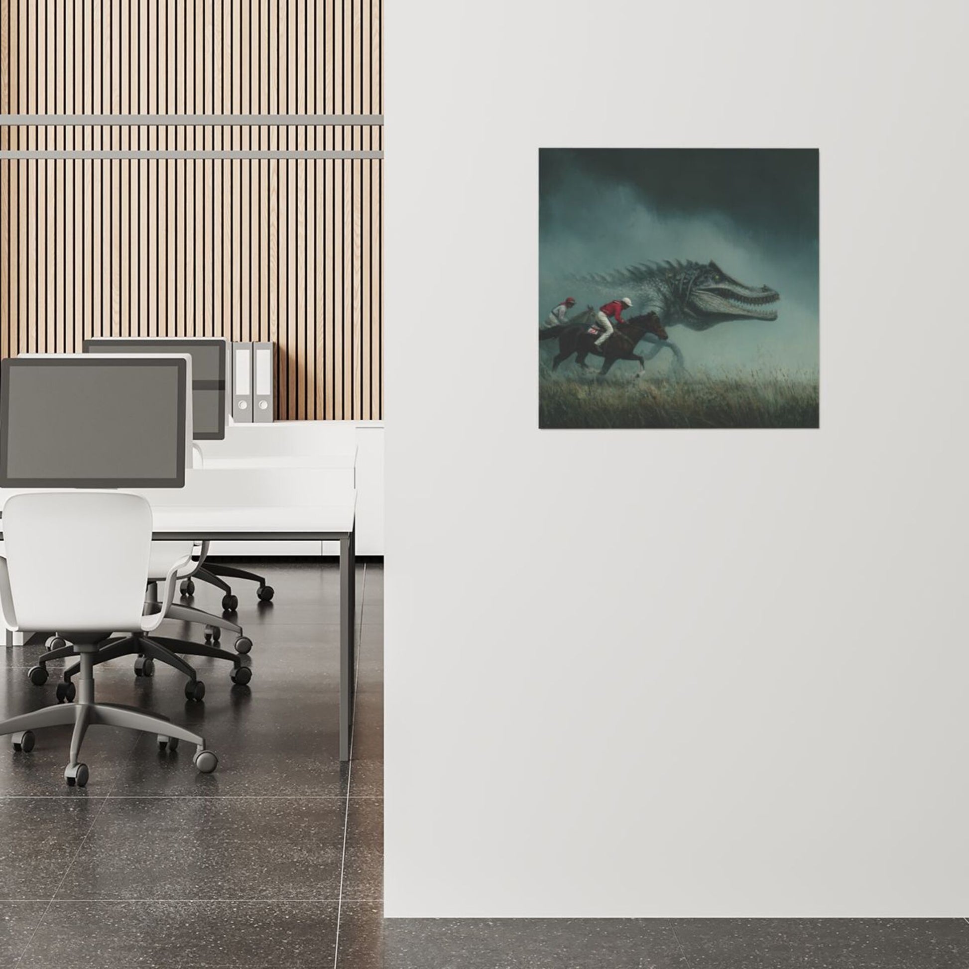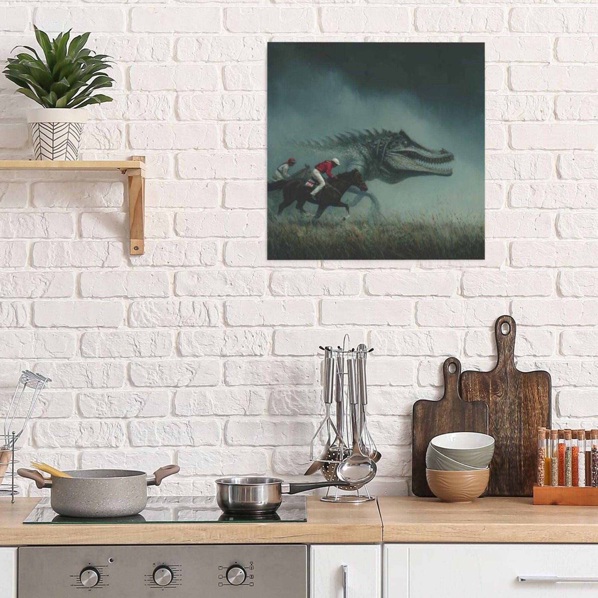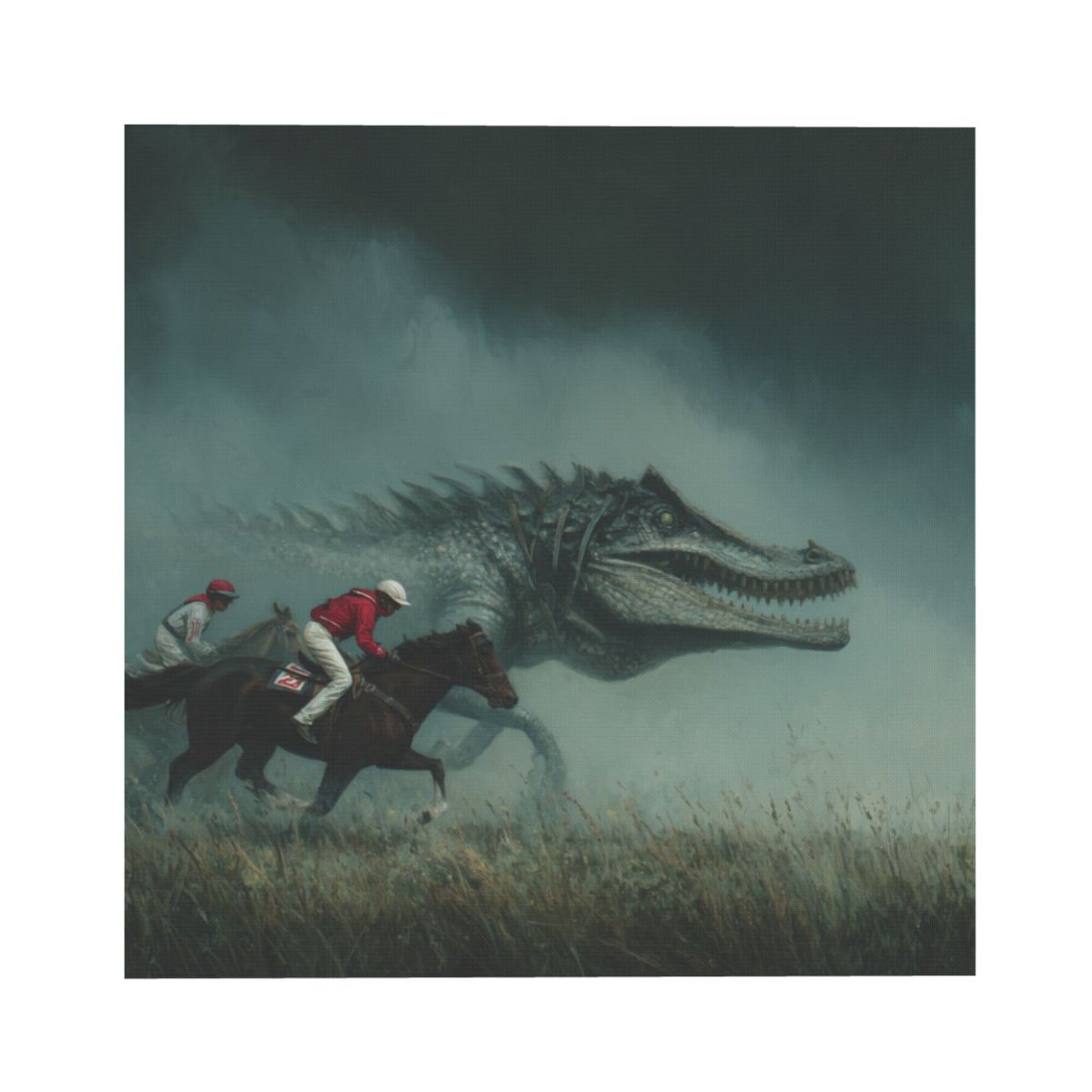 This set of frameless square decorative canvas prints presents a fantasy scene: Riders on horses, accompanied by a huge dinosaur running in a hazy field. This unconventional combination creates a mysterious and imaginative atmosphere, adding unique artistic charm to the space.