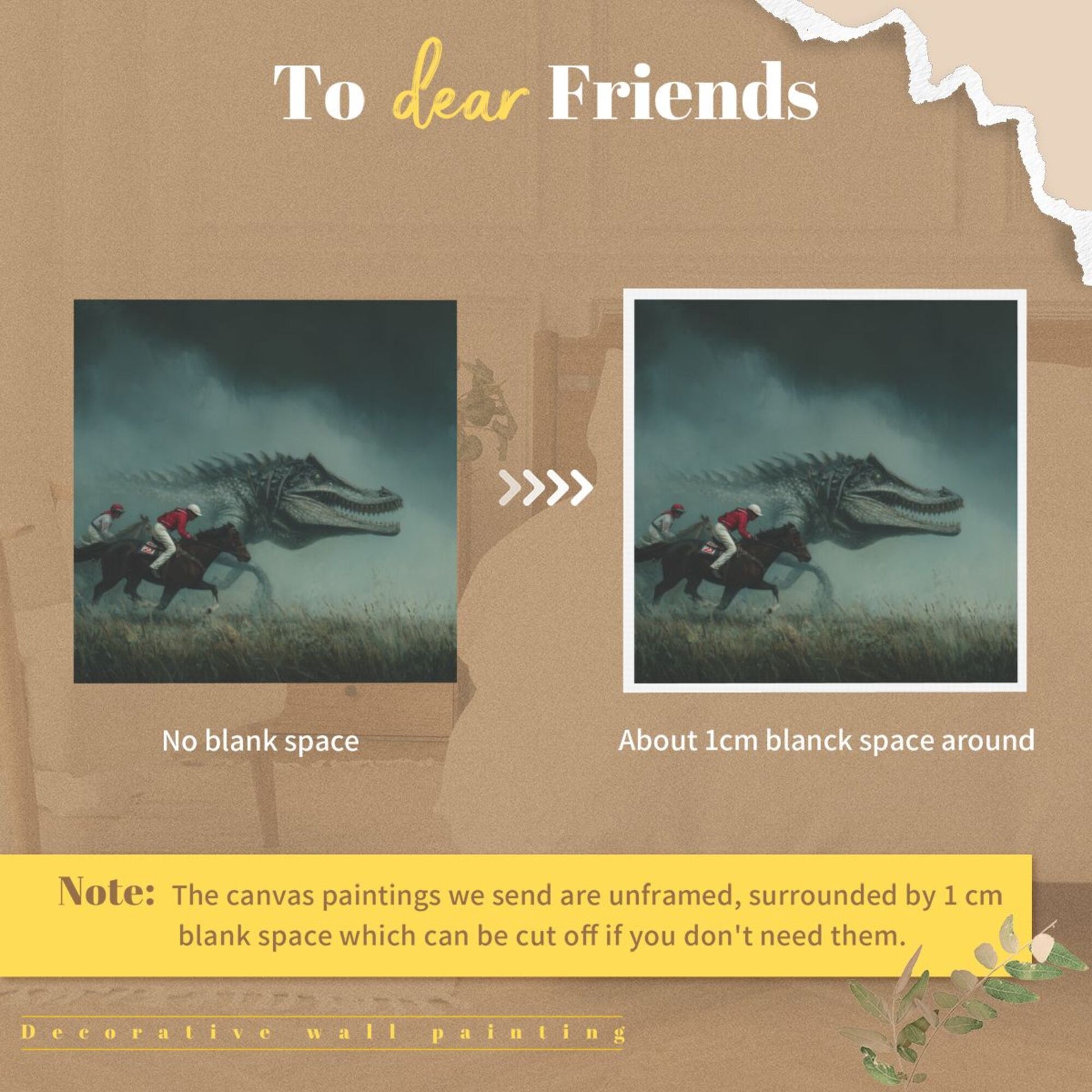 The frameless design, paired with an approximately 1 - centimeter trimmable blank edge (can be cut off if not needed), and the cylinder packaging ensures transportation safety. Whether decorating a creative studio to inspire creative thinking, arranging a personalized living room to show unique aesthetics, or as a gift for friends who love fantasy art, this set of canvases can inject fantasy and surprise into the space with its surreal horse - racing and dinosaur theme, becoming an eye - catching artistic focus on the wall.