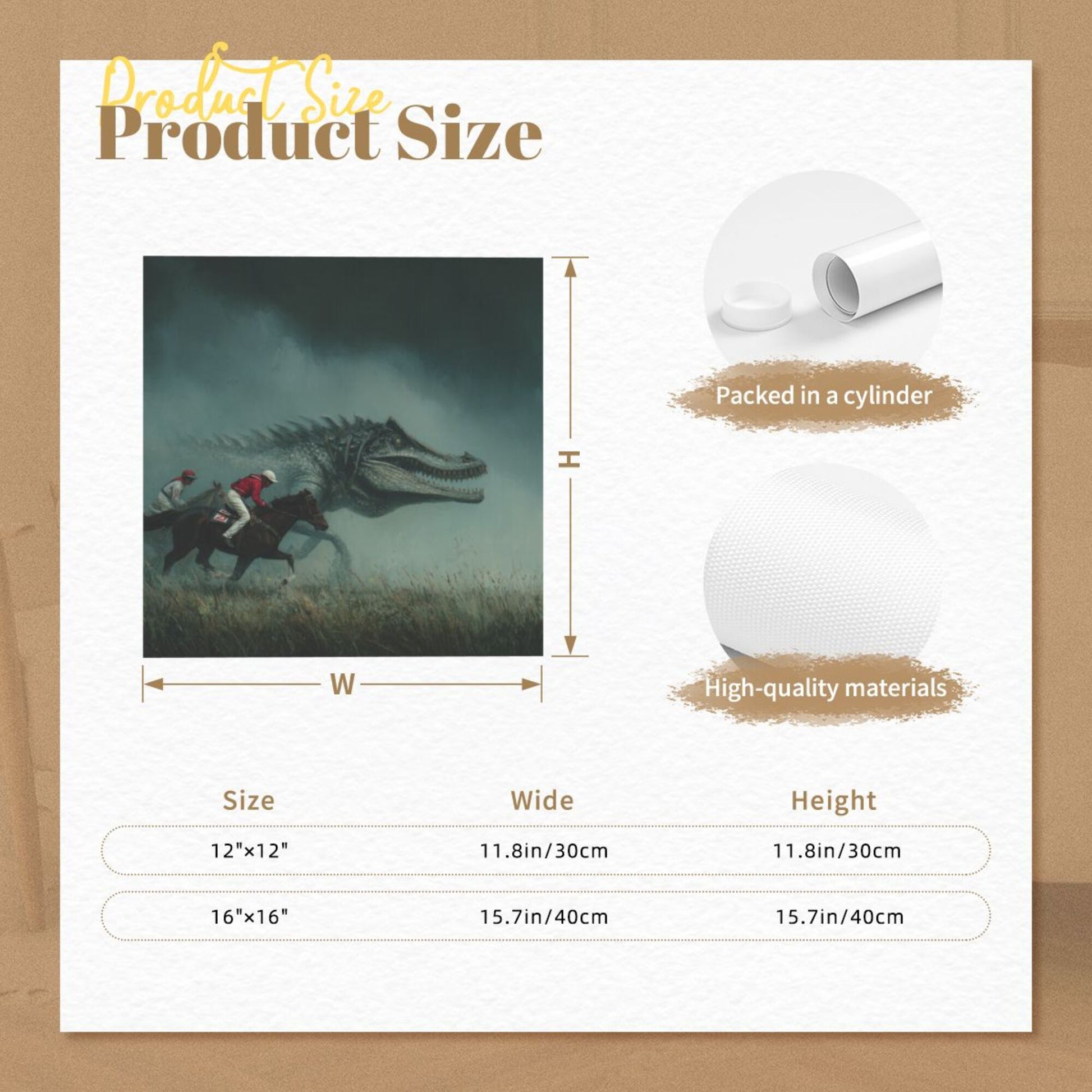 Made of high - quality canvas material, it accurately restores the details of the picture. From the texture of the dinosaur, the posture of the horse to the clothing of the rider, everything is clearly presented. The color transition is natural, making the fantasy scene vivid and realistic. Two size options are available: