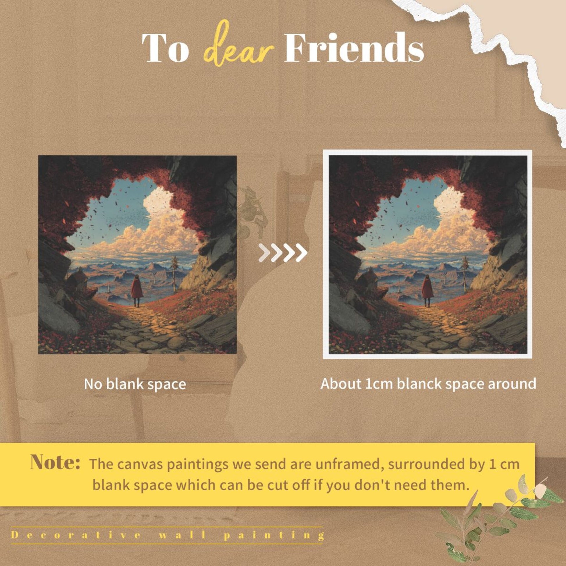 This set of frameless square decorative canvas prints, themed “Fantasy Journey”, presents a scene where a person in a red cloak stands at the entrance of a cave, overlooking the vast world, magnificent mountains, and splendid clouds. Made of high - quality canvas material, it accurately restores color layers, making the blue of the sky, the fluffiness of the clouds, and the thickness of the mountains vivid, as if leading the viewer to embark on this journey full of unknowns and surprises. Two sizes are available: 12''×12'' (width 11.8 inches/30 cm, height 11.8 inches/30 cm) and 16''×16'' (width 15.7 inches/40 cm, height 15.7 inches/40 cm), suitable for decorating different spaces such as living rooms, bedrooms, and offices. The frameless design is paired with an approximately 1 - centimeter trimmable blank edge, allowing flexible framing according to preferences; it is packaged in a cylinder to ensure the canvas is not damaged during transportation and arrives in perfect condition. Whether to add a romantic atmosphere of exploring the unknown to the home space, inject a forging - ahead spirit into the office environment, or as a heartfelt gift for friends, this set of canvases can, with its unique pictures, become the visual focus in the space and start a spiritual dialogue about courage and the distance.