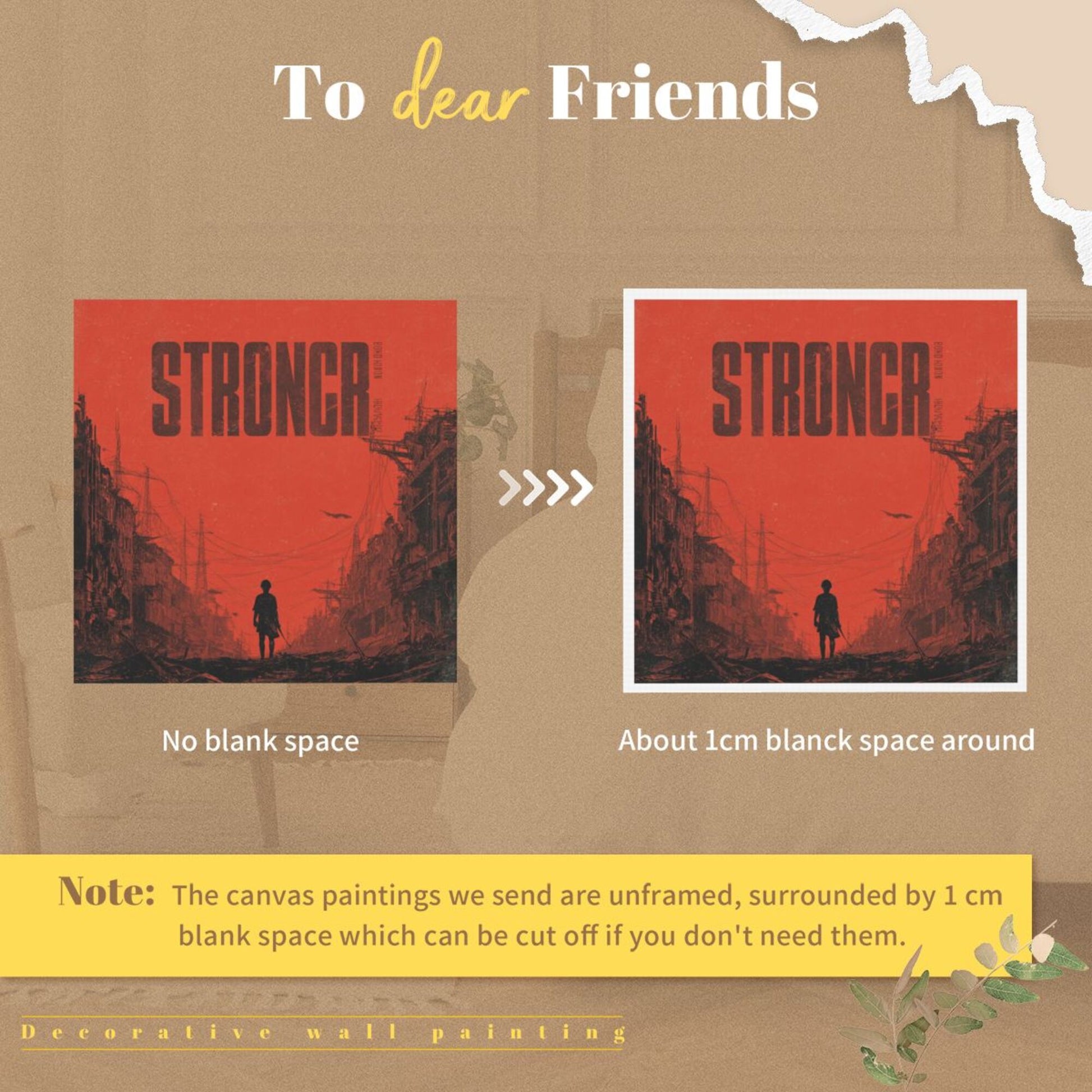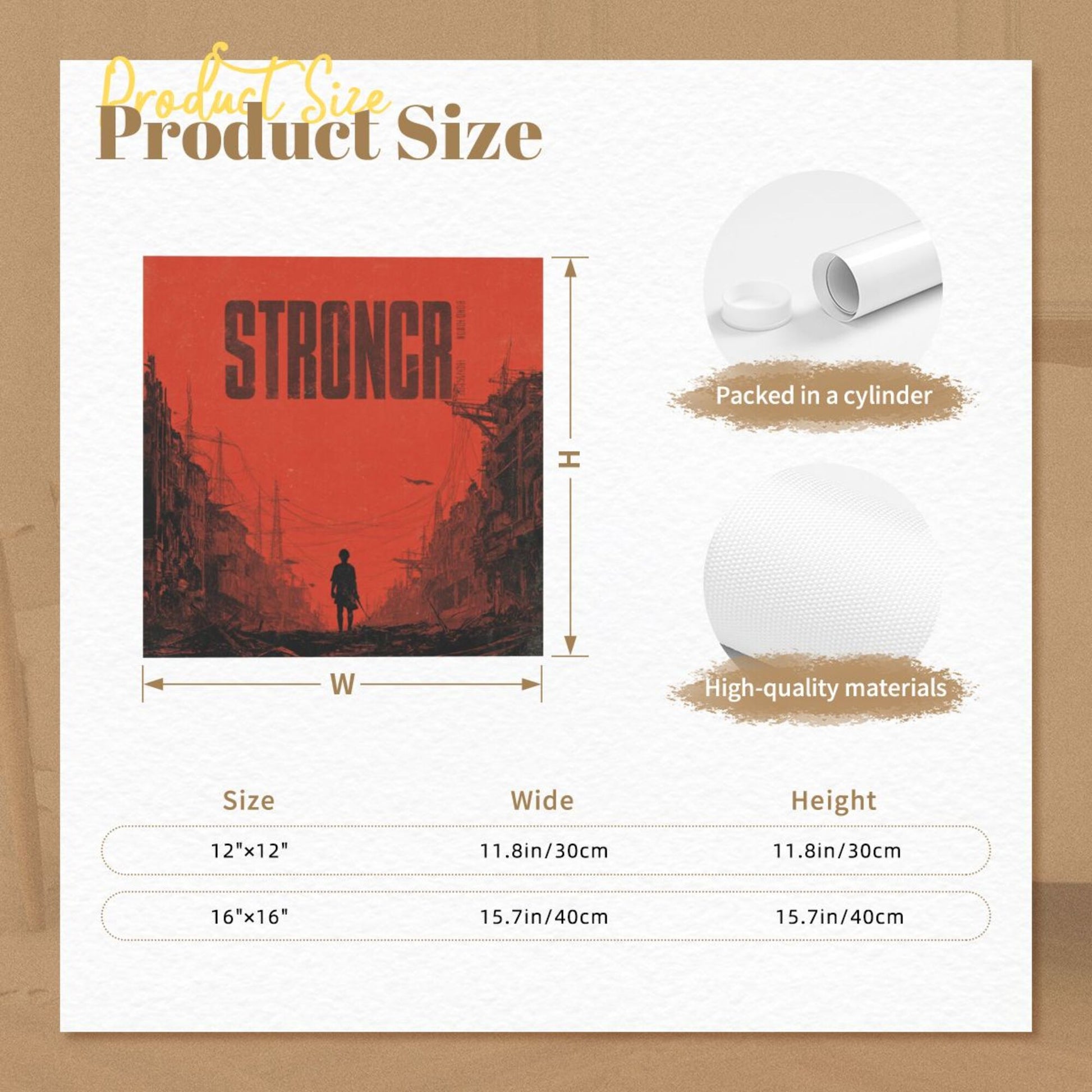 This set of frameless square decorative canvas prints centers on a highly impactful post - apocalyptic scene. The collision of red and black color schemes creates a strong visual effect. In the picture, a lone figure walks through the ruined streets, and the word “STRONGER” conveys tenacious strength, as if telling the courage to strive in a desperate situation. Made of high - quality canvas material, it accurately restores color layers and picture details, making the mottled ruins and the silhouette of the figure clearly presented, fully enhancing the atmosphere.