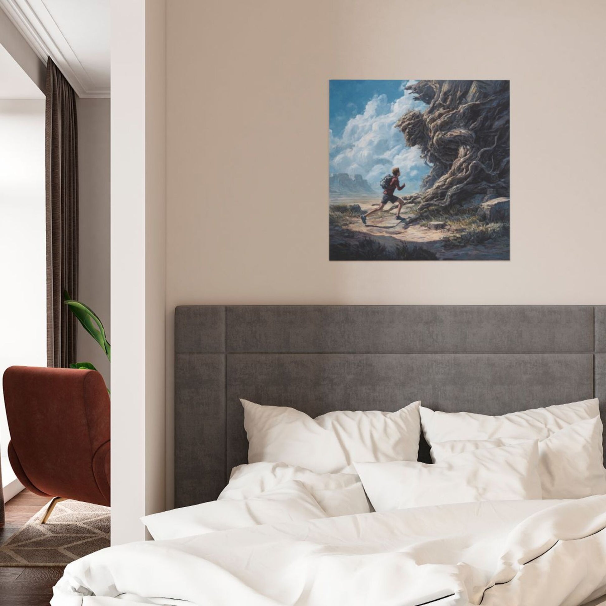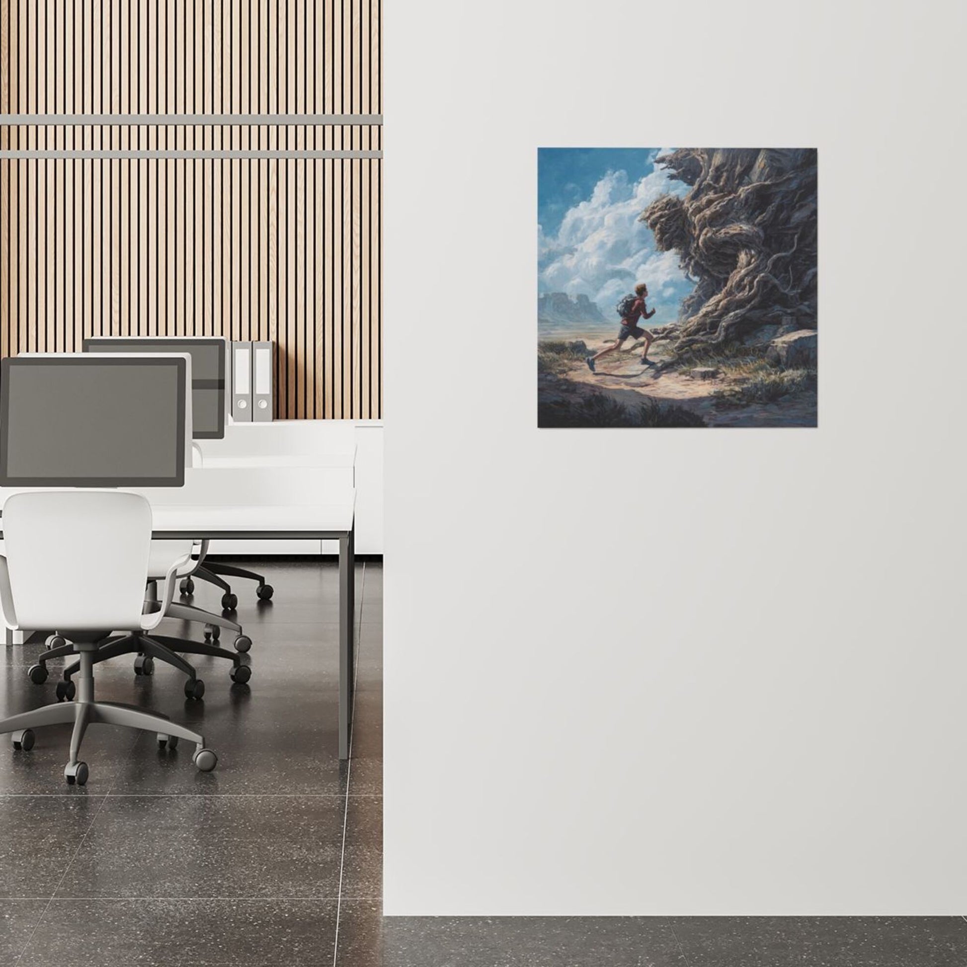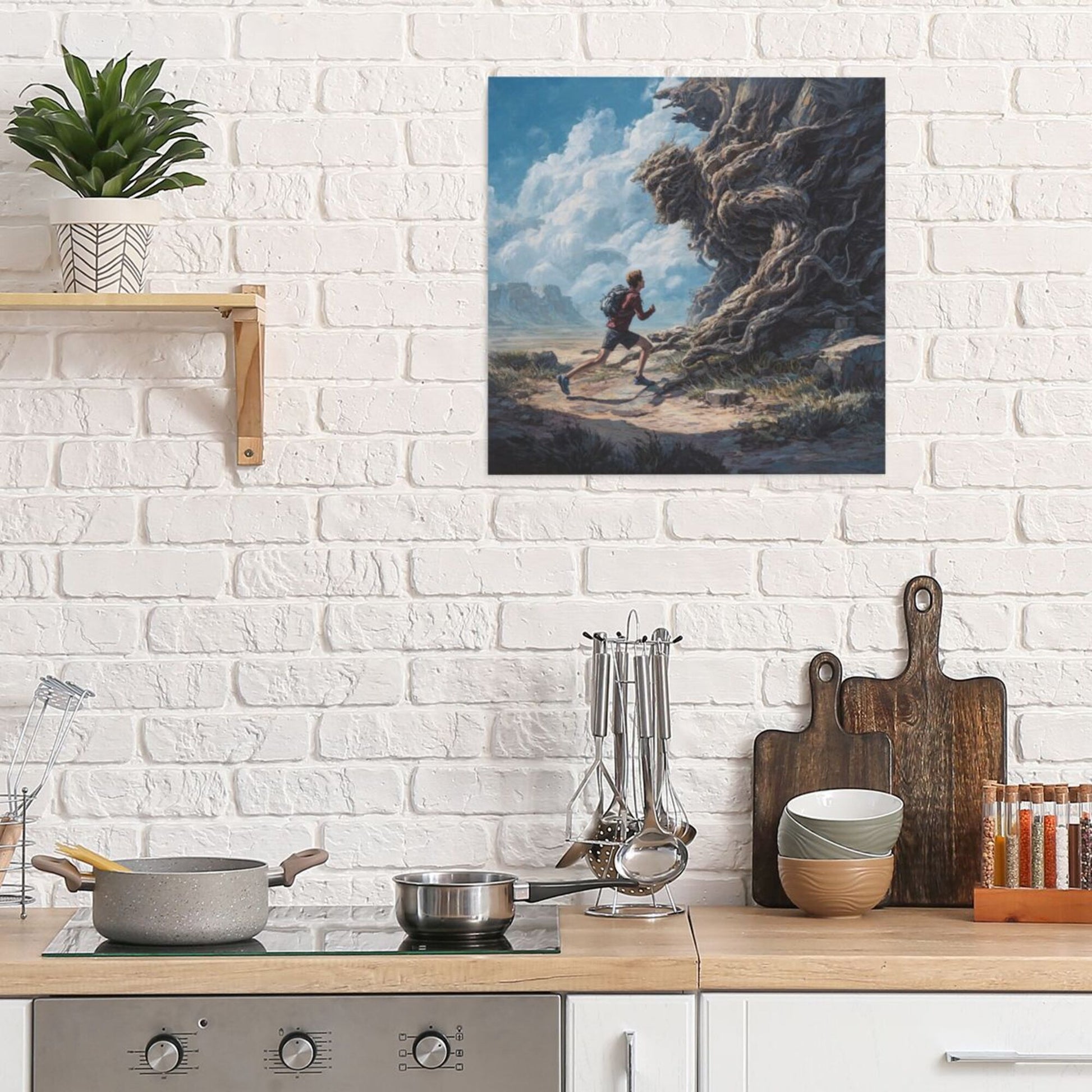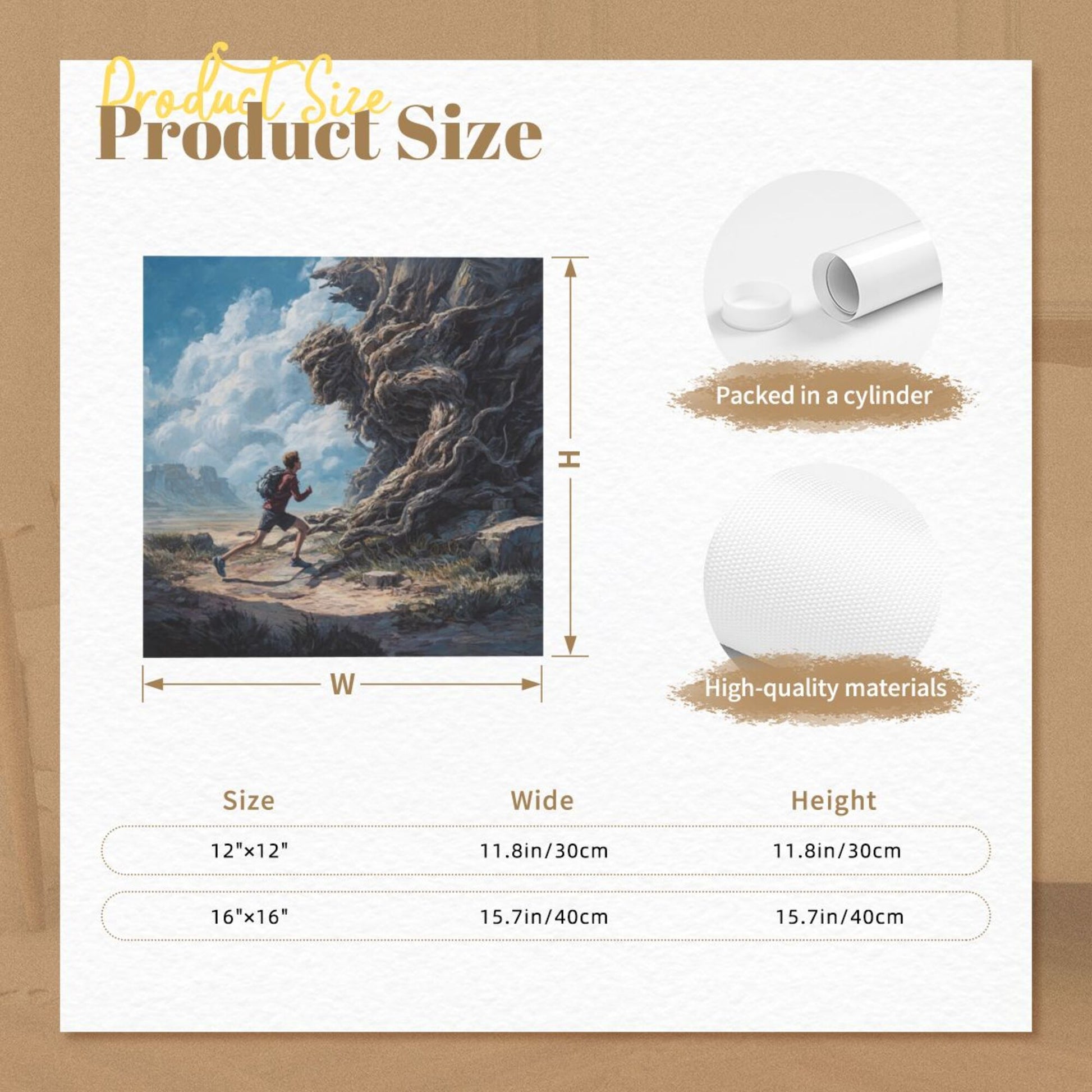 This set of frameless square decorative canvas prints focuses on the theme of wilderness exploration. In the picture, a backpacker runs towards a strange ancient tree. The vast sky, vast land, and unique vegetation interweave, creating an atmosphere full of adventure and the unknown, injecting the spirit of exploration and artistic tension into the space.
